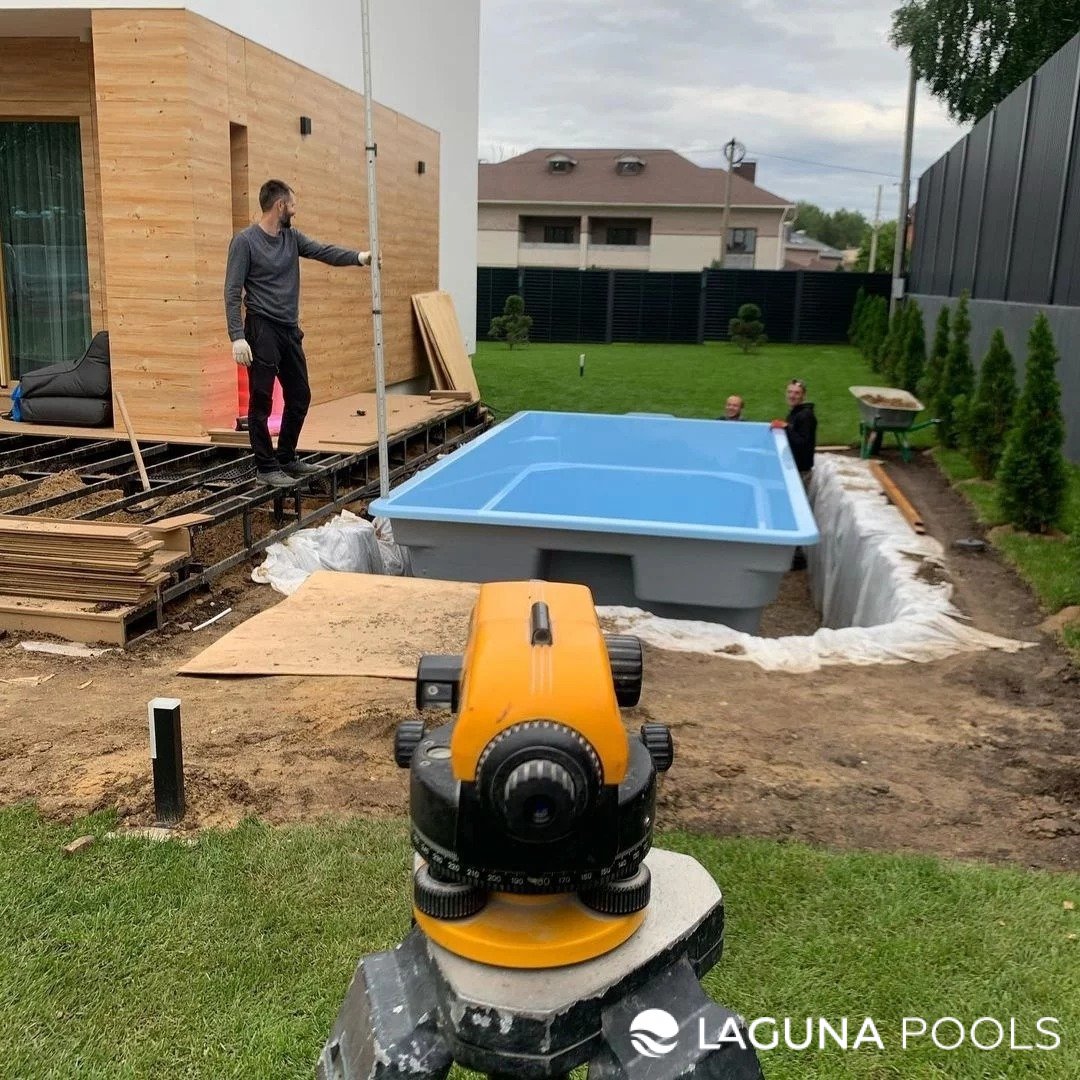 Установка композитного бассейна с нивелиром у современного дома и газона